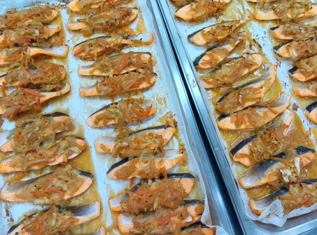 鮭のちゃんちゃん焼きは、キャベツ・にんじん・玉ねぎ・みそ・バターを鮭と一緒に焼きました。
