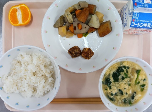 今日の献立は、ごはん・くじらの竜田揚げ・筑前煮・かきたまみそ汁・ぽんかん・牛乳でした。