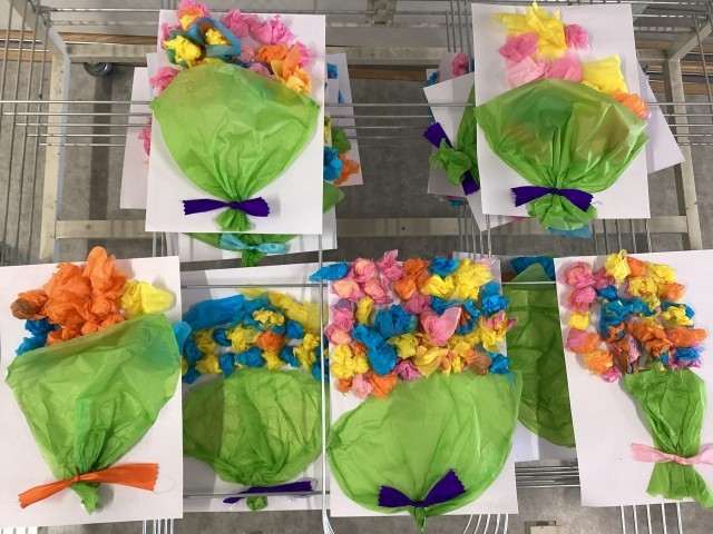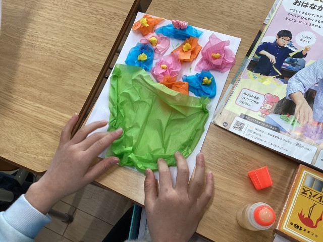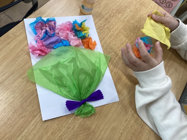 3月までに、新しい1年生のために、教室を飾っていきます。お花紙をくしゅくしゅと丸めて、のりで画用紙に貼り付けて花束を作りました。一人一人に工夫が見られ、集中して作業する姿に成長を感じました。
