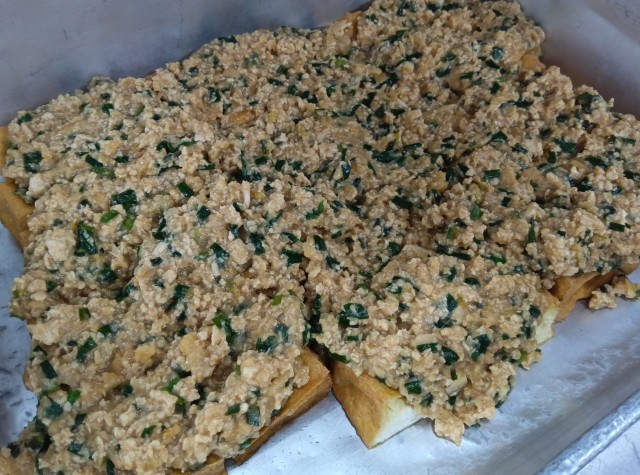 厚揚げの肉みそかけは、焼いた厚揚げに、ひき肉・たけのこ・にら・みそなどで作った肉みそをかけました。