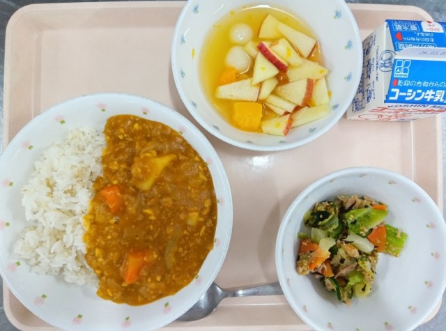 今日の献立は、ポークカレーライス・小松菜とひじきのサラダ・フルーツポンチ・牛乳でした。