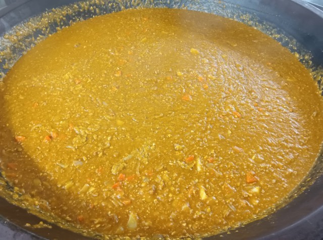 ポークカレーライスは、ひき肉や大豆・にんじん・じゃがいも・玉ねぎなどを使い、小麦粉とバター・カレー粉で作ったルウと一緒に煮込みました。