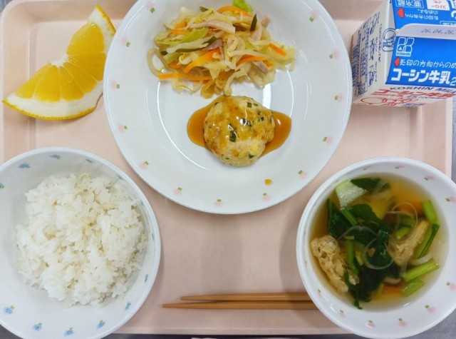 今日の献立は、ごはん・とり肉のつくね焼き・はりはり和え・いろどり汁・河内晩柑・牛乳でした。