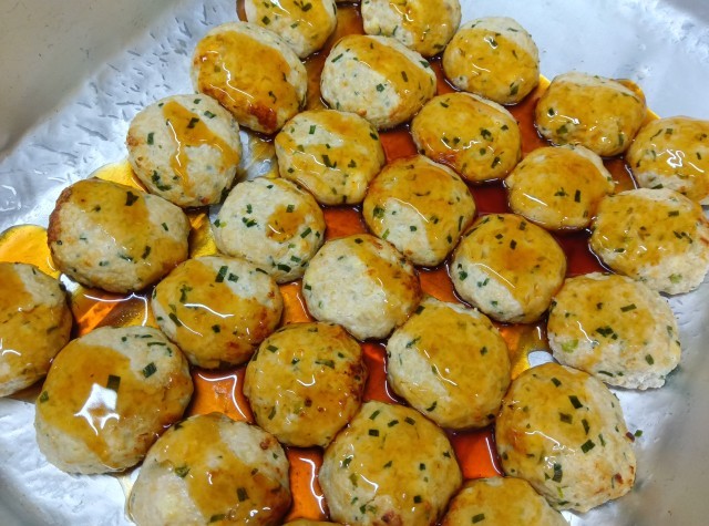 とり肉のつくね焼きは、とりひき肉・あじのすり身・大豆・豆腐・玉ねぎ・にらなどをこねて、丸めて焼きました。