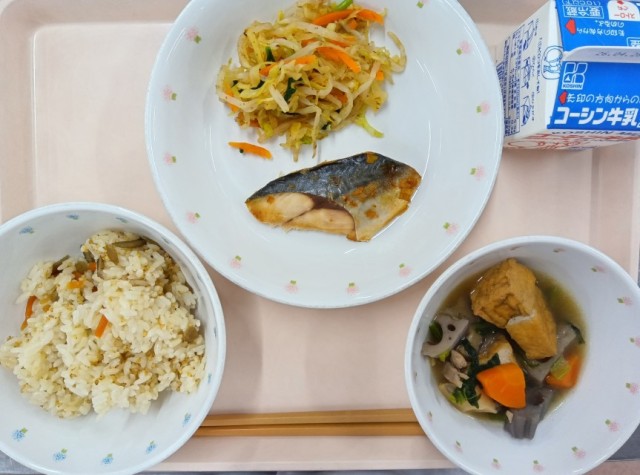 今日の献立は、かしわ飯・さばの香味焼き・小松菜のお浸し・がめ煮・牛乳でした。