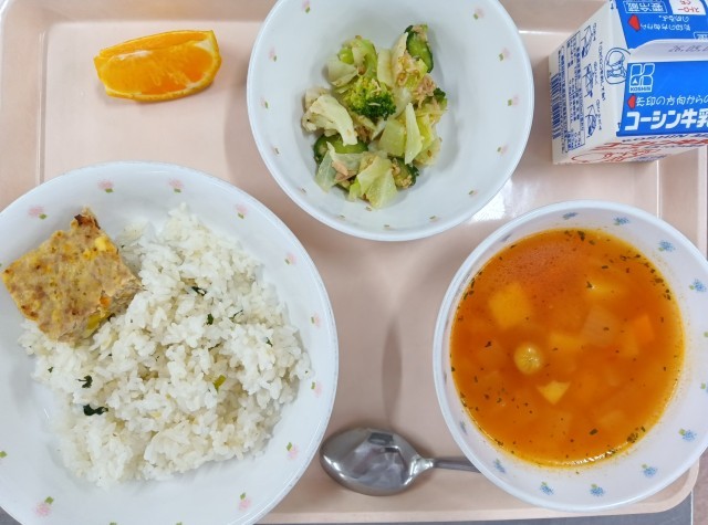 今日の献立は、小松菜ガーリックライス・チーズ入りミートローフ・花野菜のごまドレッシングサラダ・大豆のトマトスープ・デコポン・牛乳でした。