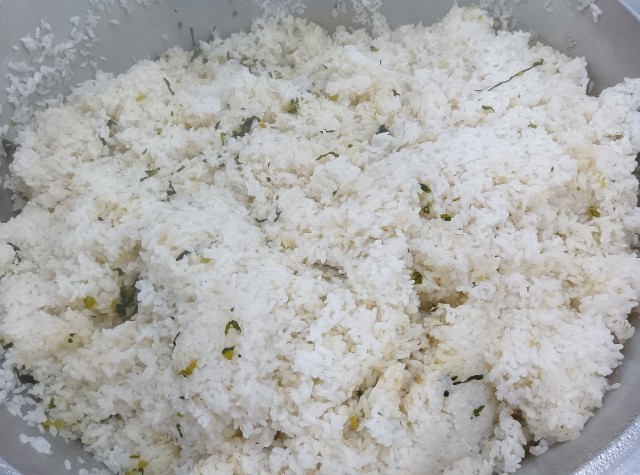 小松菜ガーリックライスは、スープやバターと一緒に炊いたご飯に、にんにく・オリーブオイル・塩・こしょう・小松菜などを混ぜ込みました。