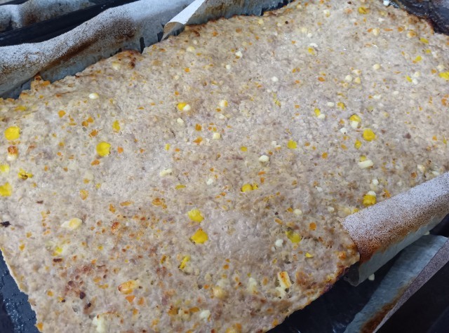 チーズ入りミートローフは、豚ひき肉・凍り豆腐・にんにく・玉ねぎ・にんじん・コーン・ダイスチーズを混ぜて、鉄板にのばし、焼いて切り分けました。