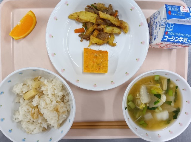 今日の献立は、たけのこごはん・五目たまご焼き・豚肉と揚げじゃが芋の炒め煮・大根と白菜のみそ汁・清見オレンジ・牛乳でした。