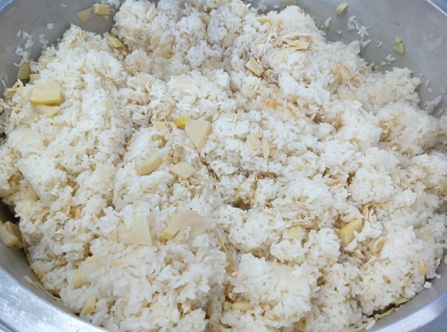 たけのこごはんは、生のたけのこを使用しました。油揚げと一緒に、しょうゆやさとうで煮て、ごはんに混ぜ込みました。