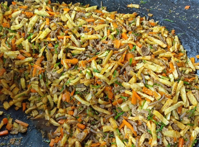 豚肉と揚げじゃが芋の炒め煮は、豚肉・にんじん・つきこんにゃくなどと、揚げたじゃが芋を炒め合わせました。
