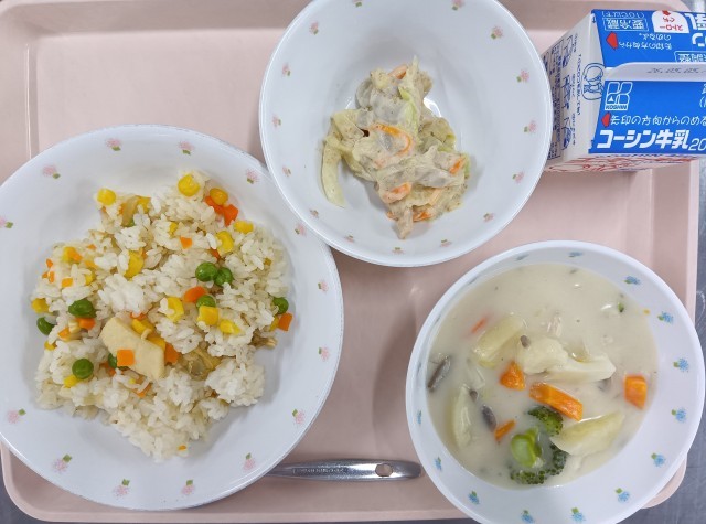 今日の献立は、コーンピラフ・鶏肉と花野菜のクリーム煮・ごぼうサラダ・牛乳でした。