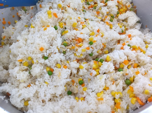 コーンピラフは、コーン・玉ねぎ・にんじん・あさり・イカを使いました。
