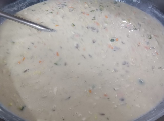鶏肉と花野菜のクリーム煮は、鶏肉・ブロッコリー・カリフラワー・にんじん・じゃが芋・白菜・牛乳・豆乳などが入っています。ルウは小麦粉とマーガリンで作りました。