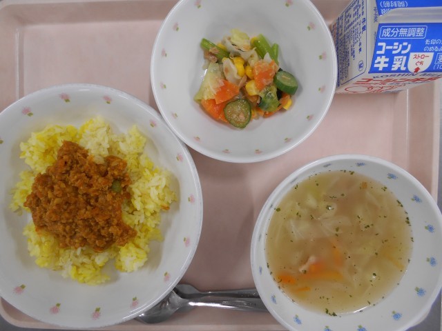 今日の献立は、ドライカレー・グリーンサラダ・キャベツのコンソメスープ・牛乳でした。