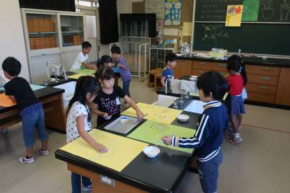 1年生が図工の時間、画用紙に大きな絵をかいています。クレヨンでかいたフラワーに絵の具を使って色をつけていきます。今日は理科室を使って図工の学習を行っています。