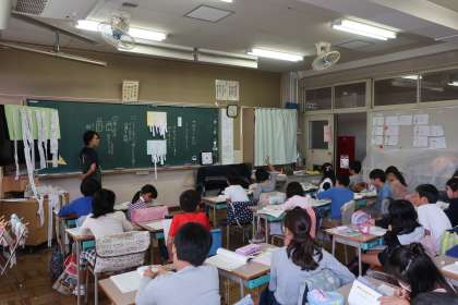 4年2組の国語の学習では、海がめの命を守る説明文を読んでいます。4年生になると、筆者の意図を捉えて、要旨をまとめていきます。叙述に即して自分の考えを導く難しい学習に向き合っています。