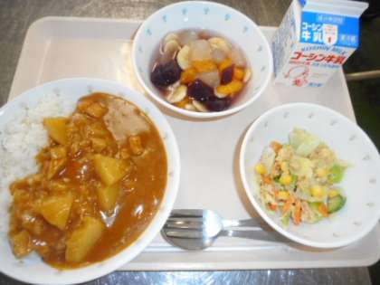 今日の献立は、カレーライス・コーンサラダ・カラフルポンチ・牛乳でした。
