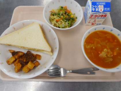 今日の献立は、ツナサンドトースト・レバーとポテトのマリアナソース・きのこサラダ・ABCスープ・牛乳でした。