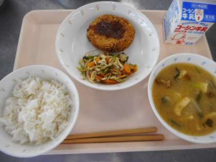 今日の献立は、ご飯・里芋コロッケ・白菜の煮びたし・なめこ汁・牛乳でした。