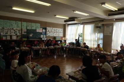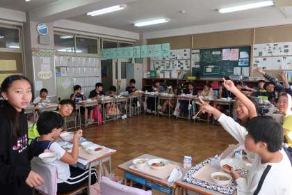 明日の体育大会前に6−1で給食を食べました。今日の献立は、応援メニューのみそカツです。「己に勝つ」。これを目標に明日は、走り、跳んできます!