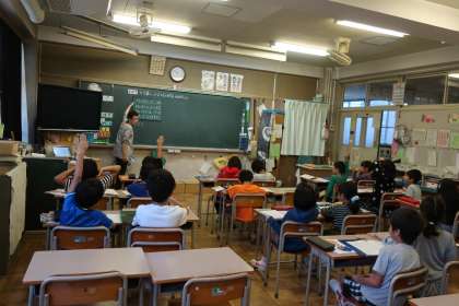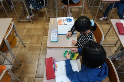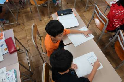 2年生のかけ算の学習です。1つ分の数がいくつ分でぜんぶの数になることを学習しています。問題を解いて発表し、身の回りにもかけ算の問題になるものがないか調べました。習熟度の分かれて学習するよさがあります。