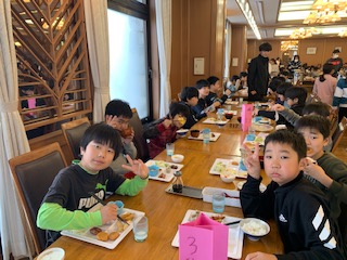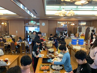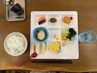 2日目の朝食です。朝食は、バイキング形式になっているので、好きな物を好きなだけ選べます。バランスよく食べていますか?