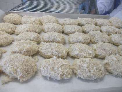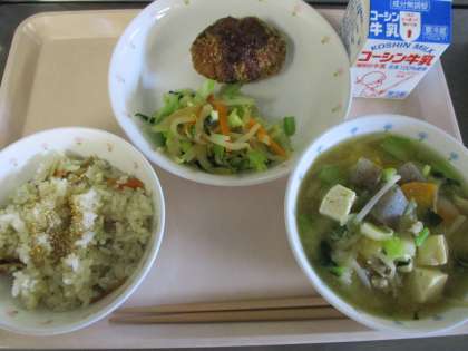 今日の献立は、炊き込みご飯・ムロアジのメンチカツ・蒟蒻の和え物・シャキシャキ野菜たっぷり味噌汁・牛乳でした。