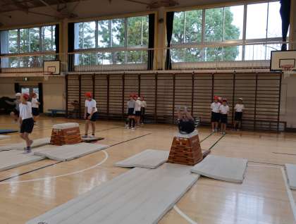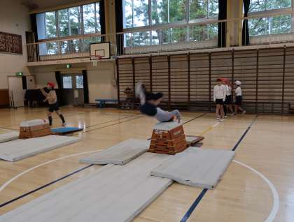 台上前転は、踏み切る時に高く跳んで前転を行います。そして、跳び箱の上で前転した時に、足を投げ出すととび上がります。何回も練習して技を美しく見せるよう努力していました。