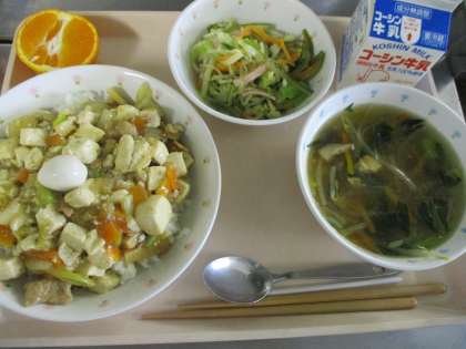 今日の献立は、豆腐の中華丼・切干大根のサラダ・春雨スープ・みかん・牛乳でした。