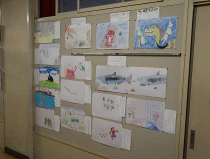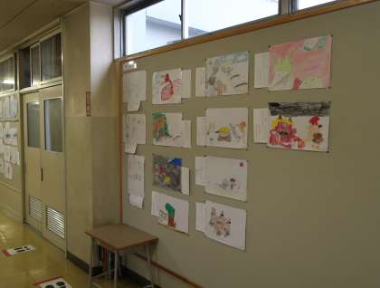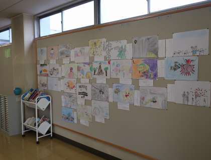 2年生の教室前の掲示板に、おすすめの本の紹介が展示されています。「おはなし びじゅつかん」として、カラフルな絵とおすすめの紹介文があり、見ていてあきない展示になっています。