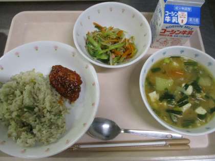 今日の献立は、コンナムルパプ・ヤンニョムチキン・ナムル・チゲスープ・牛乳でした。