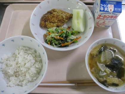今日の献立は、ご飯・サバの竜田揚げ・ツナの和え物・大根とわかめの味噌汁・りんご・牛乳でした。