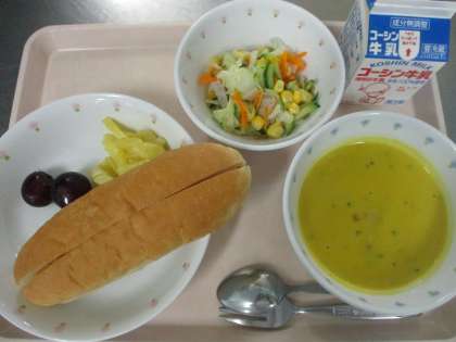 今日の献立は、カレーミートドック・フライドポテト・ハムコーンサラダ・南瓜のポタージュ・巨峰・牛乳でした。