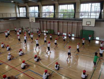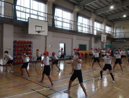 5年生は、ソーラン節を表現します。ソーラン節を本気で踊ると身体じゅうが筋肉痛になる程きつい動きです。腰を入れてかっこよく踊るために練習しています。