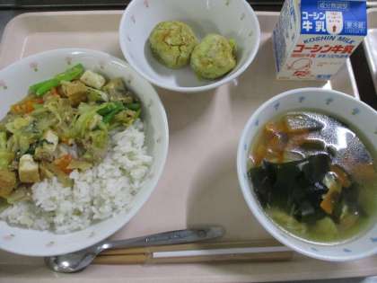 今日の献立は、家常豆腐丼・えのきの中華スープ・さつま芋ごま団子・牛乳でした。
