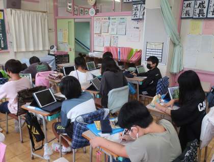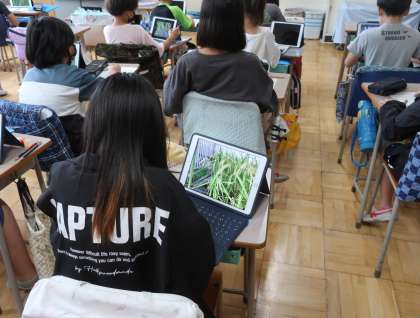 5年生が育てている稲が見事な実りをつけています。タブレットで撮影して、稲の成長をまとめています。