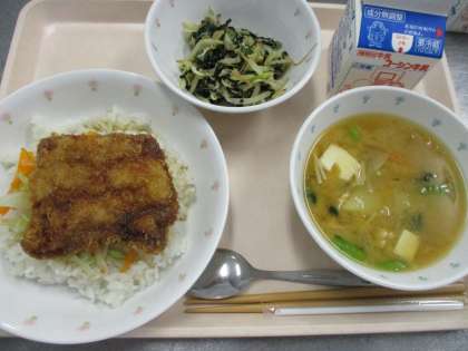 今日の献立は、ソースカツ丼・磯香和え・うち豆入り味噌汁・牛乳でした。