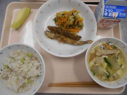 今日の献立は、枝豆ご飯・ししゃもの南蛮漬け・ひじきとコーンの和え物・冬瓜汁・メロン・牛乳でした。