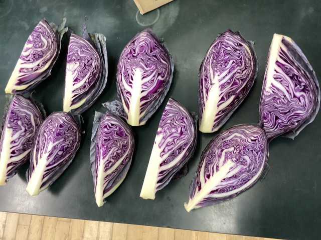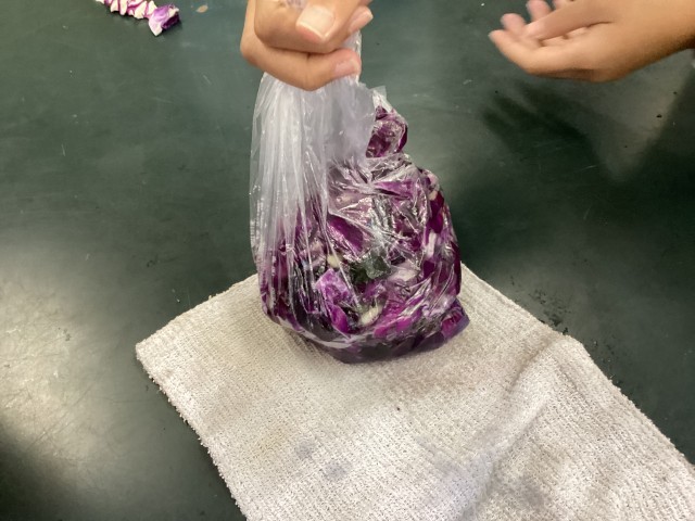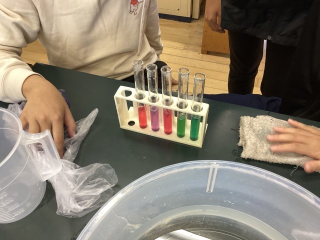 6年生の理科の授業で、紫キャベツで作った液体を使っても、水溶液が酸性、中性、アルカリ性のどれかであることを調べることができるという実験を行いました。きれいな色の変化に感激していました。