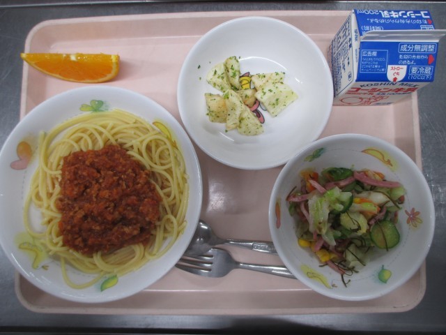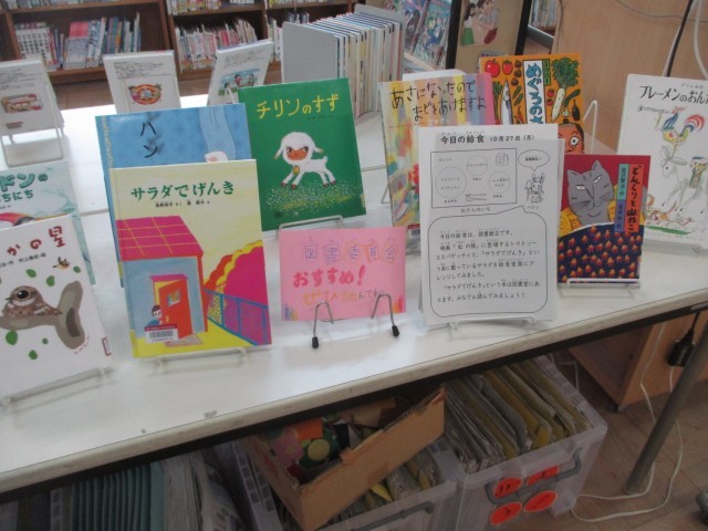 今日の給食は、読書献立です。「紅の豚」にちなんだトマトソーススパゲッティと絵本「サラダでげんき」に出てくるサラダを作りました。今日から読書週間です。他の本にもたくさんおいしそうな料理が載っています。図書室の本を読んでみましょう。