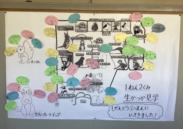 1年 生活科「いきものだいすき」 公開日 2025/10/30 更新日 2025/10/30 できごと 生活科見学(行船公園・自然動物園)から帰ってきて、動物たちを見て気づいたところをクラスでまとめました。動物たちに吹き出しをつけて、その動物の特徴や、見た感想を話しながら書いていきました。初めての校外学習は楽しく、そして充実したものになりました。 いいね(0)