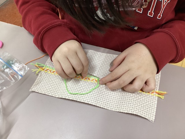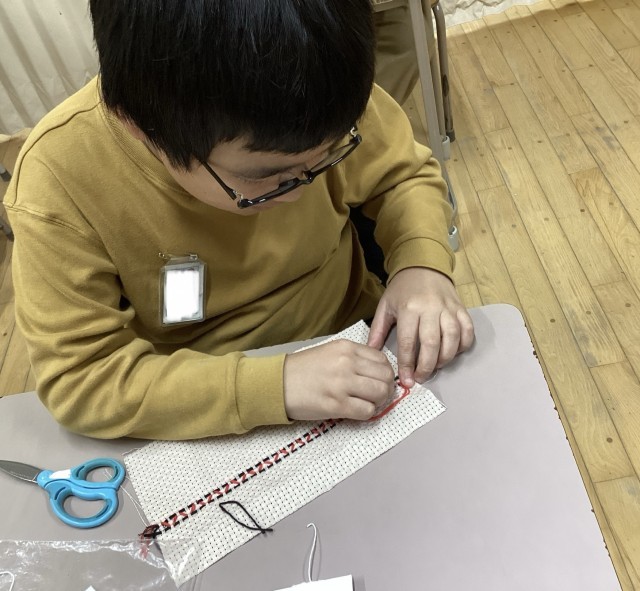 生活単元学習では、スウェーデン刺繍でティッシュケースを作り始めました。