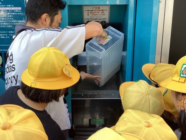 手作業で玄米にしたかぜのこ米を精米機にかけ、白米にしました。機械から白色の米が出てきた瞬間、歓声が上がりました。