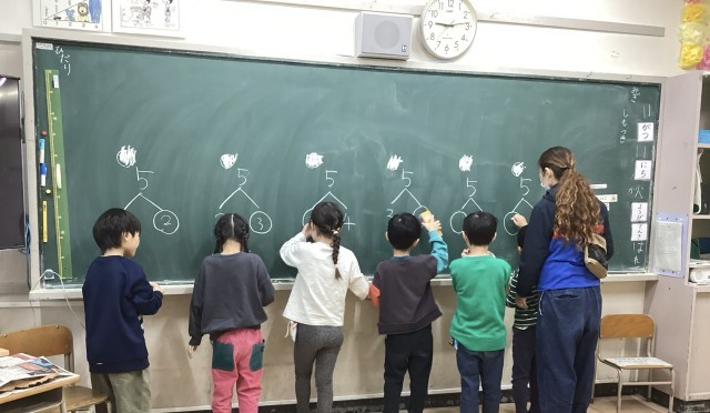 「いくつといくつ」では、黒板に問題の答えを一人ずつ書いて答え合わせをしました。