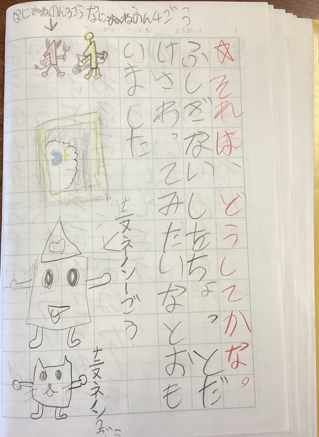 「見なれない生きもの」「カタコトの日本語を話す」「立っている」というヒントからそれぞれが思い思いの『ナニヌネノン』を描きました。