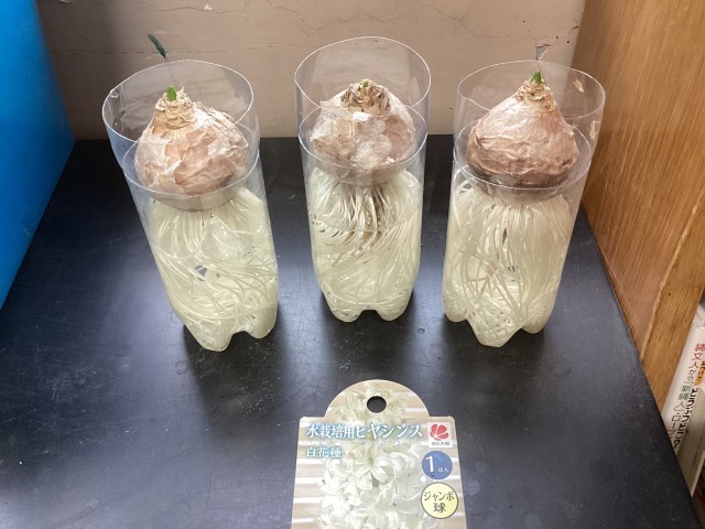 今回は、普段は土の中で見えない根の観察として、ヒヤシンスの水栽培を始めました。