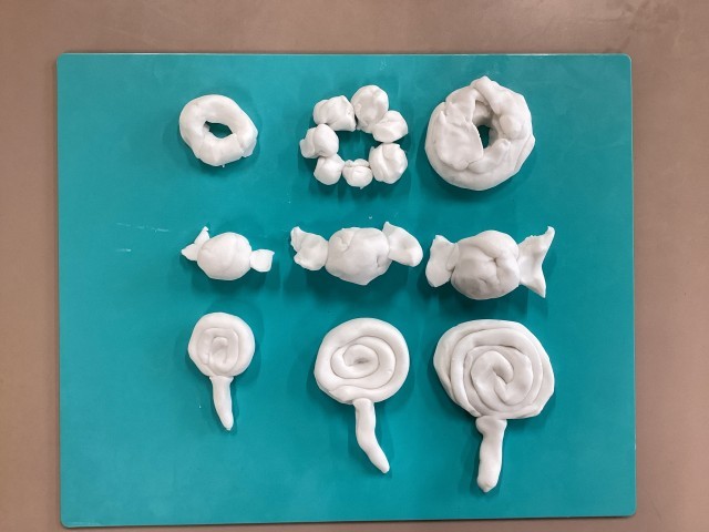 自分が作りたいお店屋さんの品物を粘土で作りました。