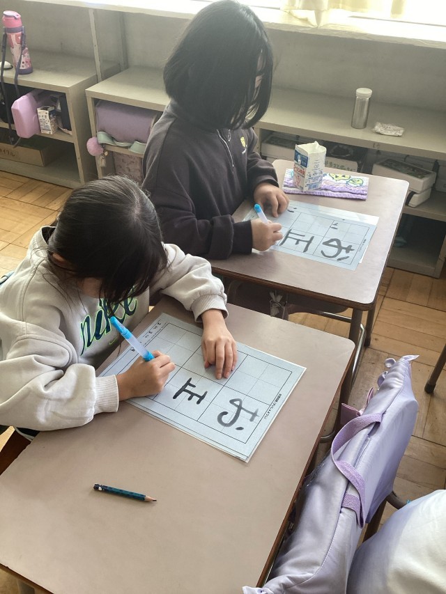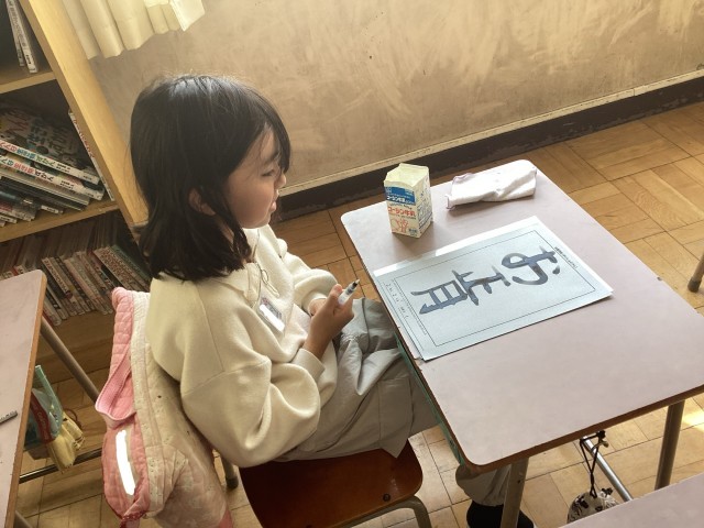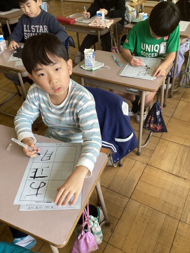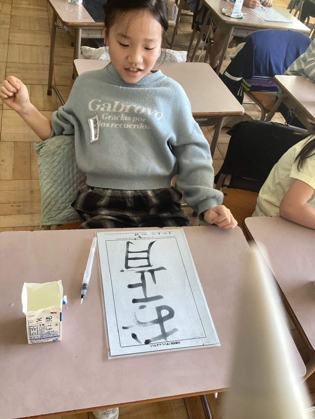 2年 書写「水ふでで書いてみよう」 公開日 2025/12/11 更新日 2025/12/11 できごと 2年生は書写の時間に水筆を使った活動に取り組んでいます。先日は「お正月」と大きく書く練習をしました。低学年は書き初めも硬筆で行いますが、水筆を使うことでとめ・はね・はらいなどの毛筆特有の運筆感覚を養うことにつながります。 +2 いいね(0)