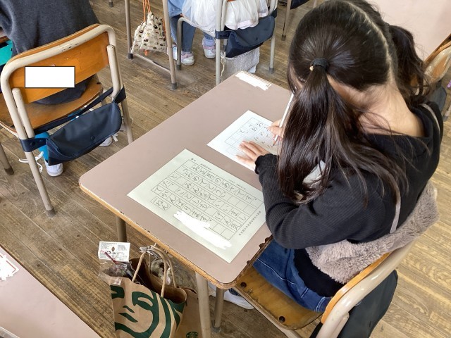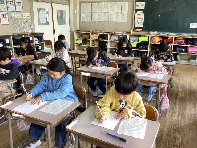 1回目では姿勢、書き方、机の上の物の置き方などを学びました。2回目は、文字の形や文字を間違えないための工夫などを学びました。そして、12月最後の3回目では、最後まで集中して、文字を間違えないように書くことを目標に頑張りました。